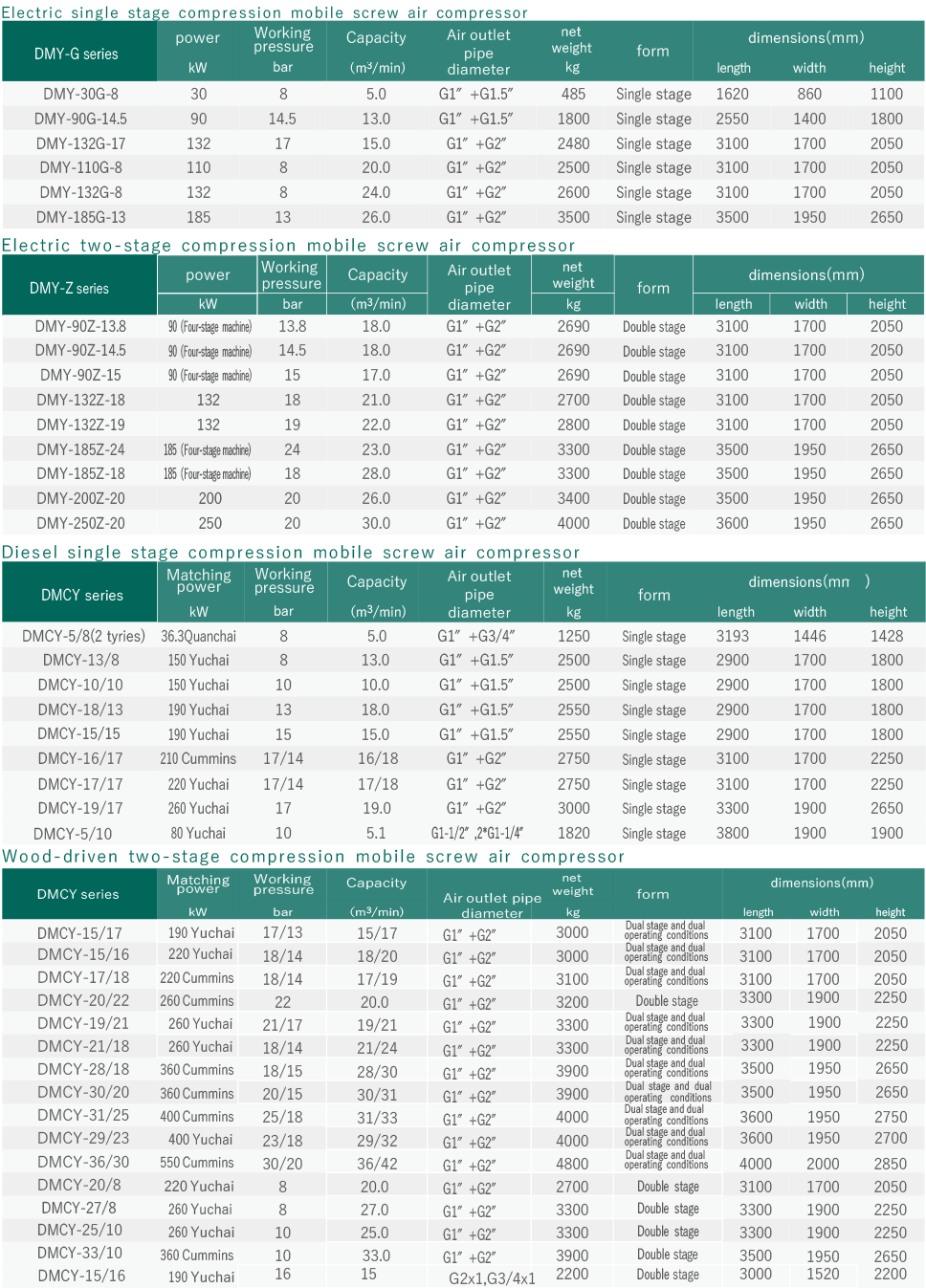 Электрический портативный винтовой компрессор: мощность от 30 до 250 кВт, расход воздуха до 30 м³/мин, рабочее давление 8–24 бар. Дизельный портативный винтовой компрессор: мощность от 150 до 550 кВт, расход воздуха до 42 м³/мин, рабочее давление 8–30 бар.